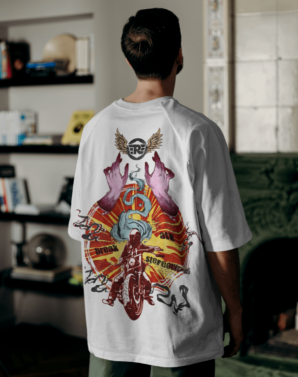 Make a bold statement with this striking oversized t-shirt that’s as powerful as your passion for breaking barriers! Featuring an electrifying graphic of a biker charging forward against a vibrant, sunburst background, this design is infused with dynamic elements like serpentine smoke, hands raised in defiance, and the empowering message 'Break All Stereotypes.' With intricate detailing and artistic flair, this t-shirt merges rebellion with style.